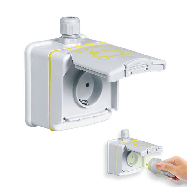 - Verstärkte, Steckdose, Robust und Wassergeschützt IP 55 (mit geschlossenem Deckel) . Entwickelt für aufladbare Elektro- und Hybridfahrzeuge
